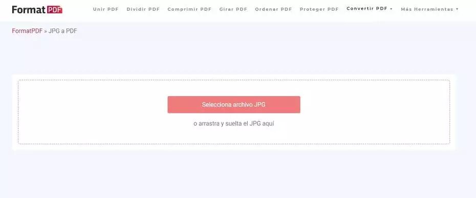En el momento en que necesitemos pasar un documento en JPG (JPEG también es válido) a PDF, es donde veremos todas las virtudes de hacerlo con FormatPDF. Para conseguirlo tenemos dos opciones; una de ellas es la arrastrar el archivo directamente desde su ubicación hasta la parte central de la web o pulsar el botón Selecciona archivo JPG y buscar donde lo tenemos en nuestro ordenador, para colocarlo en el lugar adecuado para trabajar con él.