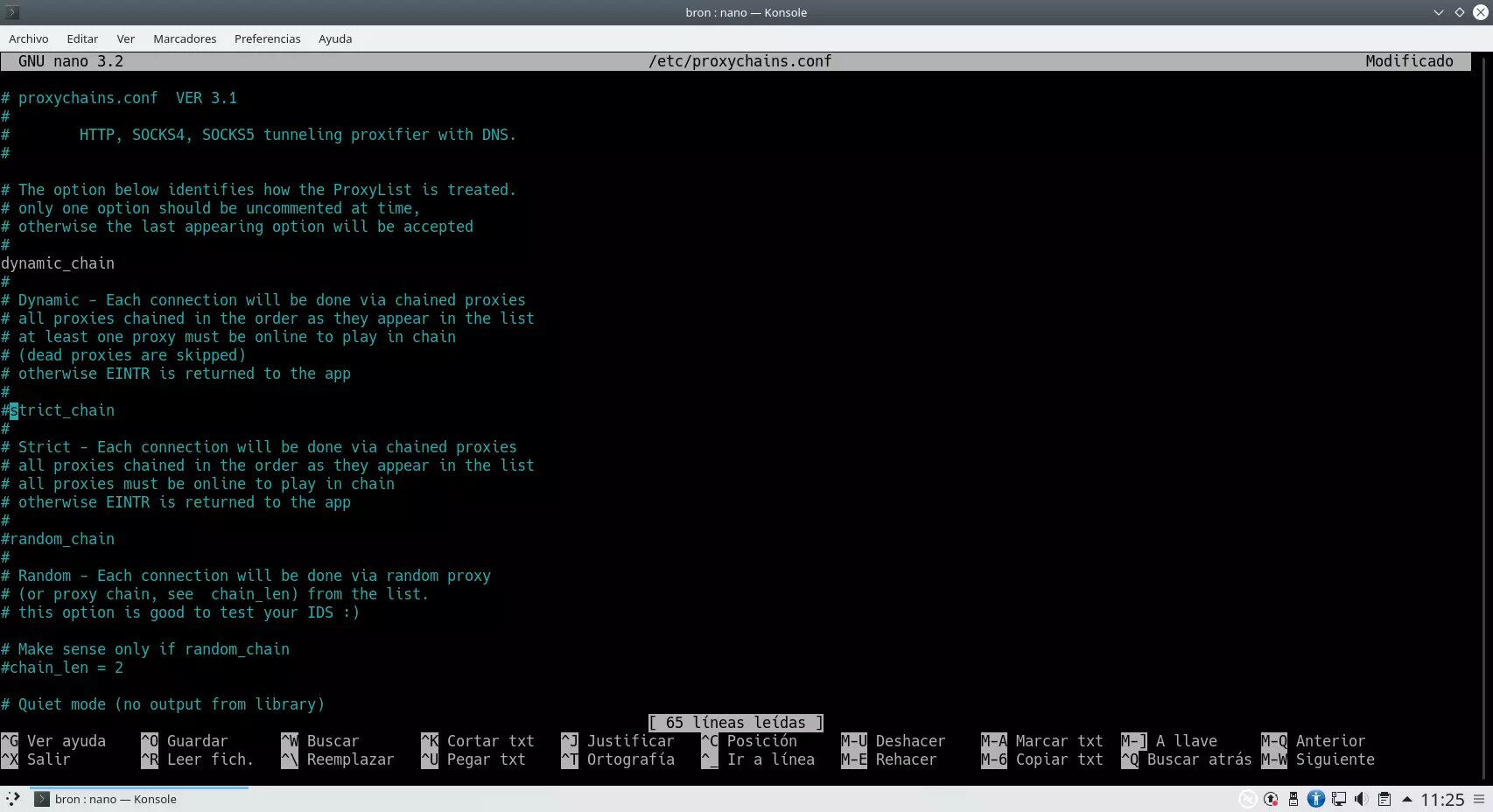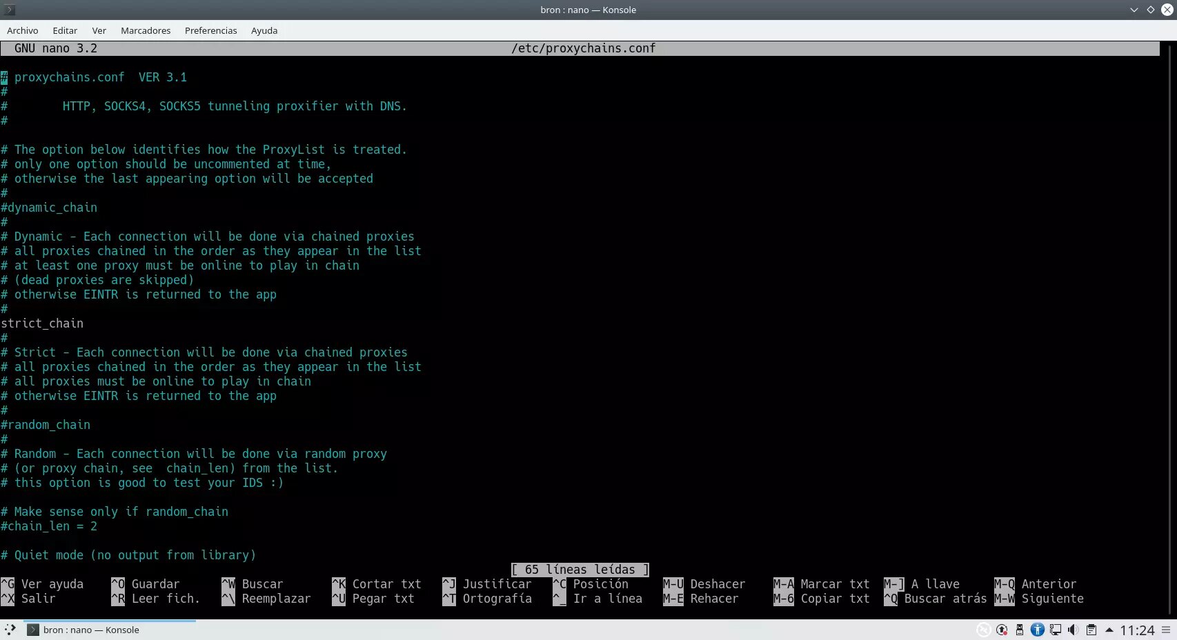 Con Tor ya iniciado vamos a modificar el archivo de configuración de Proxychains, para ello teclearemos: