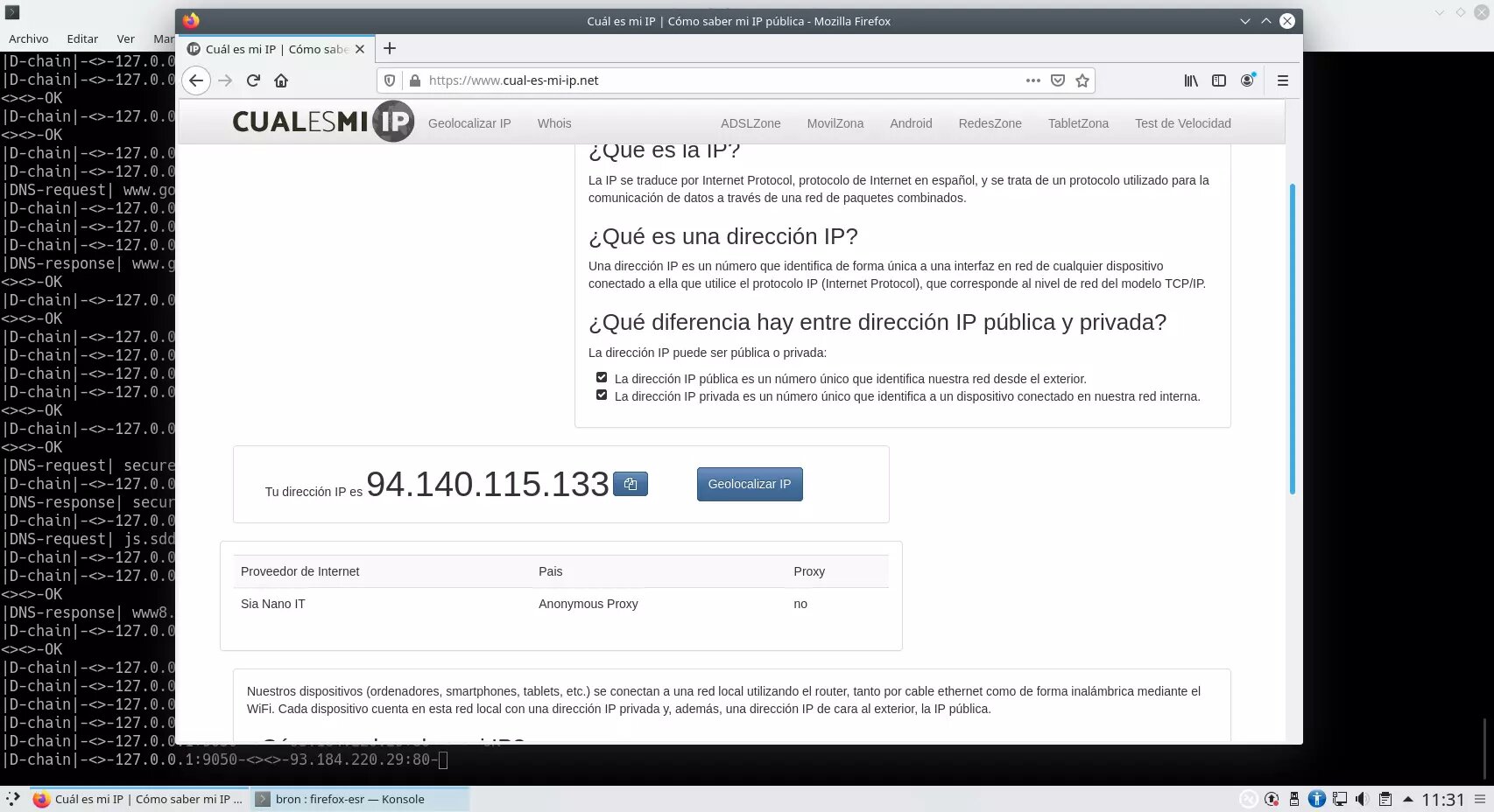 Y comprobar desde cual-es-mi-ip.net que la IP que obtenemos no es la misma que tenemos realmente en nuestra conexión, sino que está ofuscada por la red Tor.