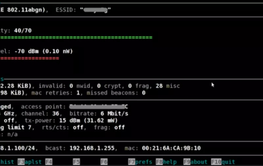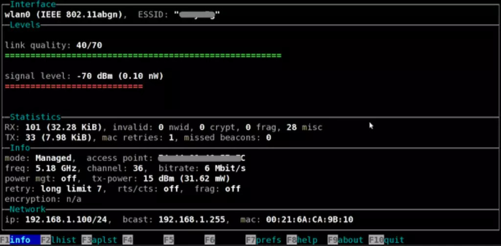 Una vez que hayamos hecho más grande la pantalla de la consola para adaptarse perfectamente al programa, volvemos a ejecutar el comando en el terminal, y automáticamente nos saldrá el monitoreo de todos los valores del enlace Wi-Fi al que estamos conectado actualmente. La información que nos aparecerá en la consola cuando ejecutamos Wavemon, es la siguiente: