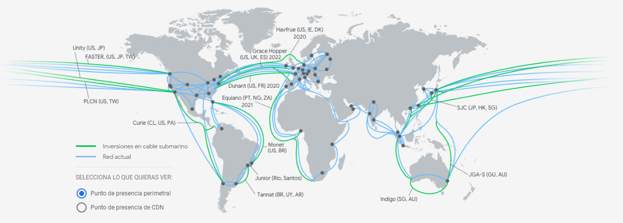 No es el único cable submarino de Google, ni mucho menos. Uno de los más recientes es Dunant, un cable de larga distancia con 12 pares de fibra óptica y la capacidad de transportar hasta 250 Tbps que une Estados Unidos con Europa. En la imagen inferior podemos ver la infraestructura de Google y su red de cables actual.