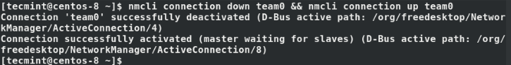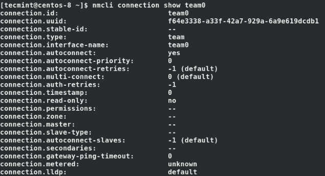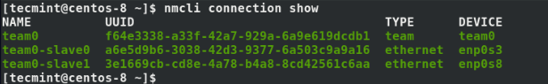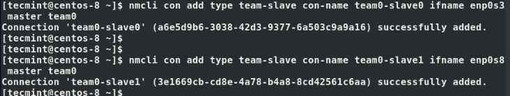 $ nmcli con add type team-slave con-name team0-slave1 ifname enp0s8 master team0