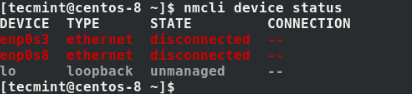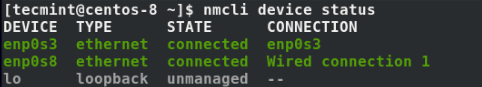 Para configurar la formación de equipos de NIC usaremos la práctica herramienta nmcli que se puede utilizar para la gestión del servicio NetworkManager . En mi sistema, tengo 2 tarjetas NIC que voy a unir o combinar para crear una interfaz lógica de equipo: enp0s3 y enp0s8. Esto puede ser diferente en su caso.
