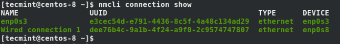La salida confirma la existencia de 2 conexiones de red activas. Para recopilar más información sobre las interfaces como UUID , ejecute el comando: