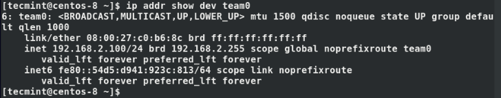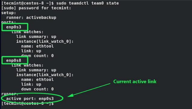 Cuando compruebe el estado de la interfaz de formación de equipos, encontrará que el enlace se enp0s8 ha activado y proporciona conexiones al servidor. ¡Esto confirma que nuestra configuración está funcionando!