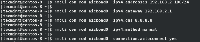 Luego, configure la dirección IP para la team0interfaz como se muestra usando el comando nmcli . Asegúrese de asignar las IP de acuerdo con el esquema de direcciones IP y subred de su red.