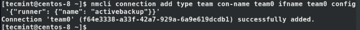 $ nmcli connection add type team con-name team0 ifname team0 config '{"runner": {"name": "activebackup"}}'