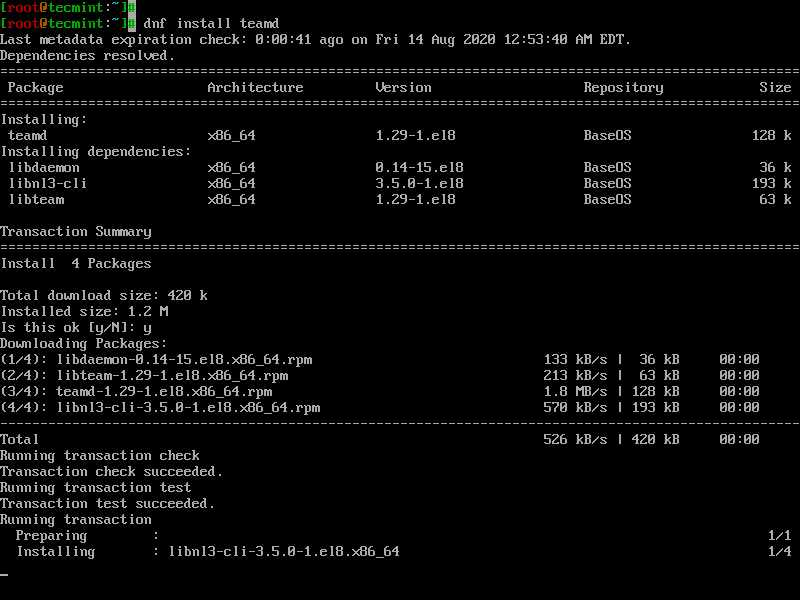 Teamd es el demonio responsable de crear un equipo de red que actuará como interfaz lógica durante el tiempo de ejecución. De forma predeterminada, viene instalado con CentOS / RHEL 8 . Pero si, por cualquier motivo, no está instalado, ejecute el siguiente comando dnf para instalarlo.