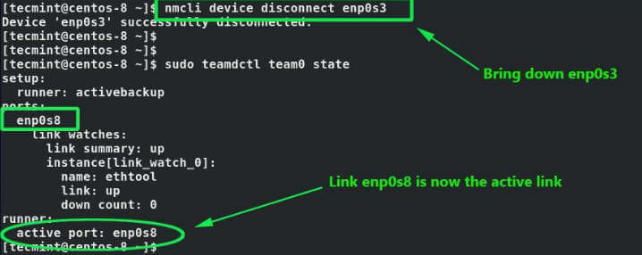 Para probar nuestro modo de equipo de respaldo activo, desconectaremos el enlace actualmente activo -enp0s3- y verificaremos si el otro enlace se activa.