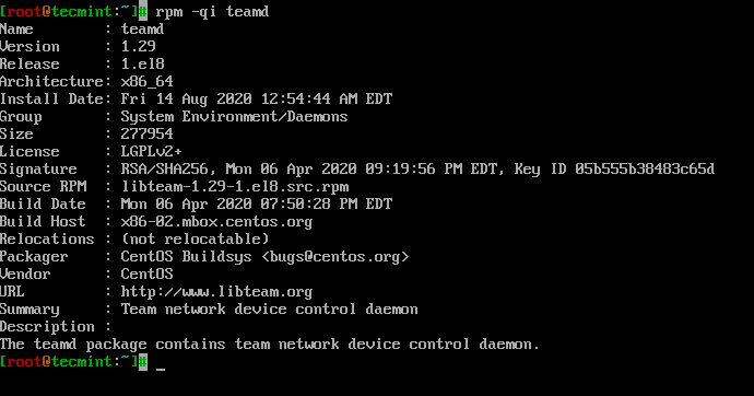 Una vez instalado, verifique que teamd esté instalado ejecutando el comando rpm :